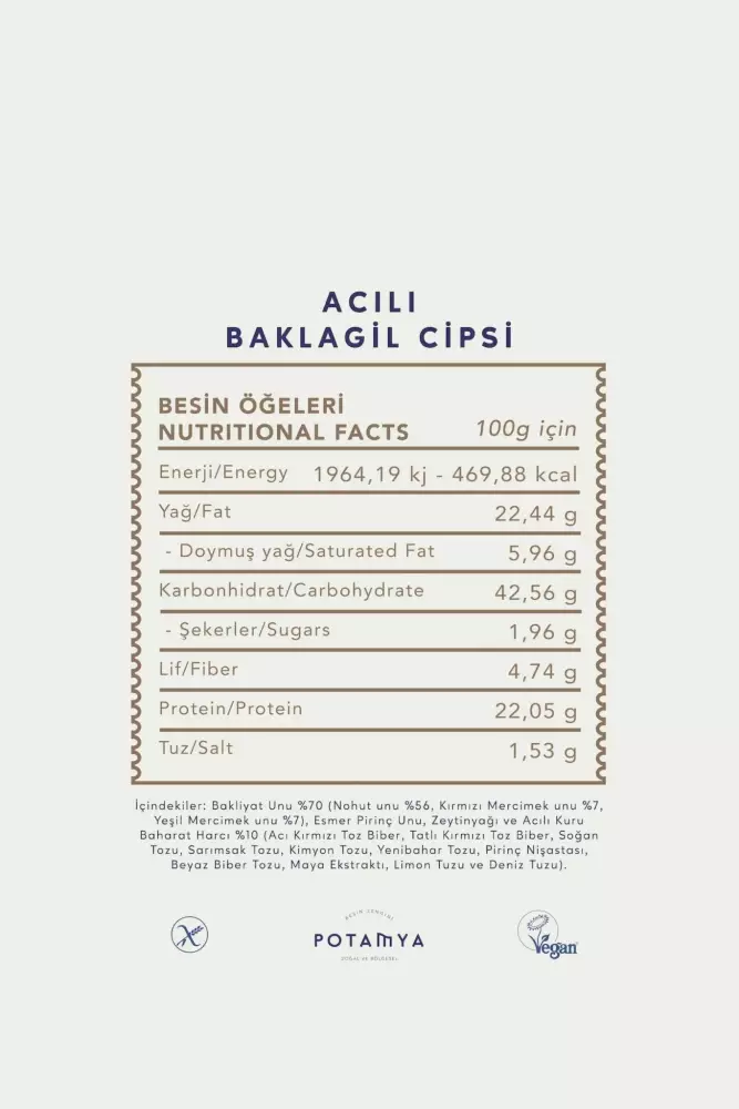 İçindekiler: Bakliyat unu %70 (nohut %56, kırmızı mercimek %7, sarı mercimek %7), esmer pirinç unu, zeytinyağı, acılı kuru baharat harcı %10 (acı kırmızı toz biber, tatlı kırmızı toz biber, soğan tozu, sarımsak tozu, kimyon tozu, yenibahar tozu, pirinç nişastası, beyaz biber tozu, maya ekstraktı, limon tozu, deniz tuzu).