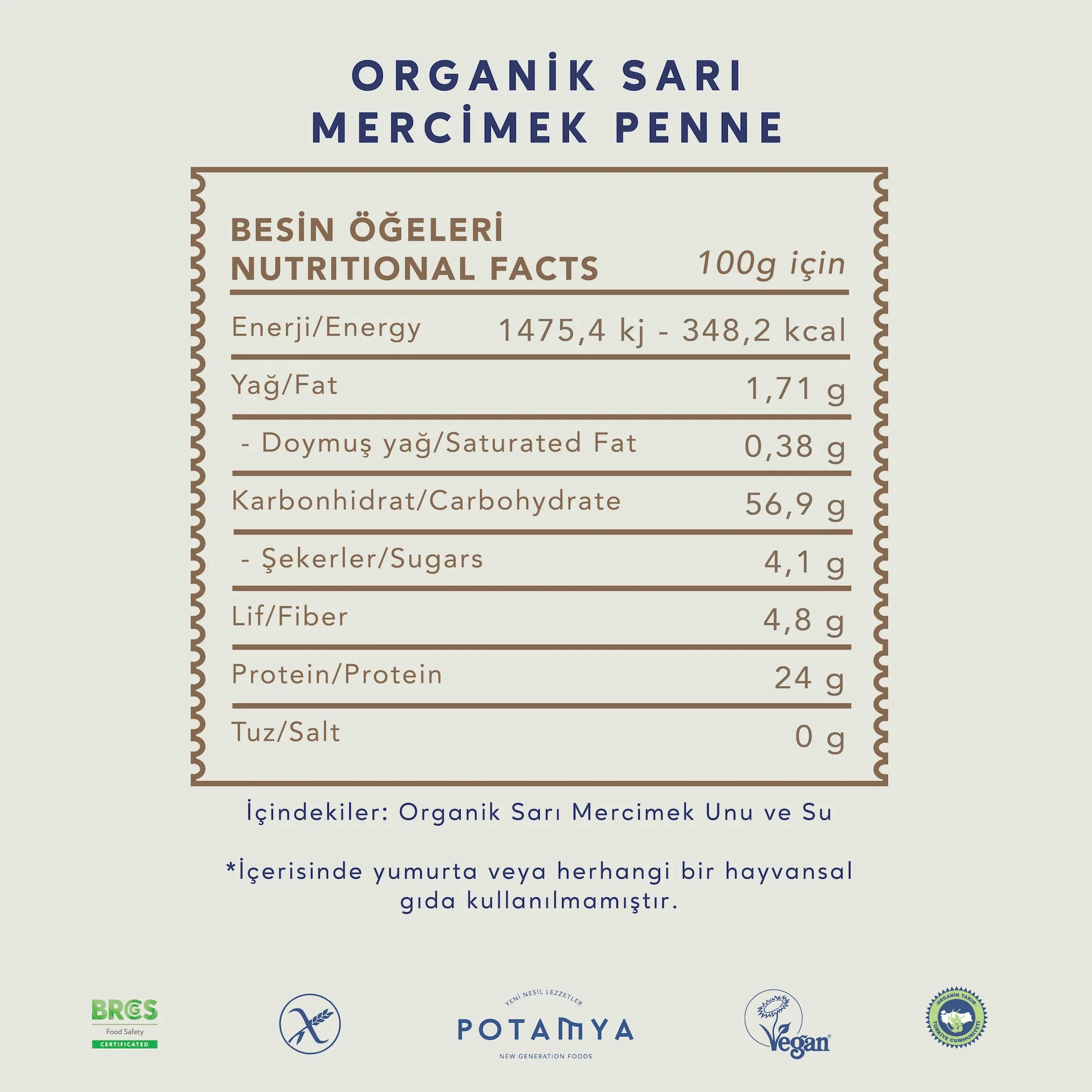 Potamya Organik Sarı Mercimek Penne Makarna Glutensiz (240 gr)