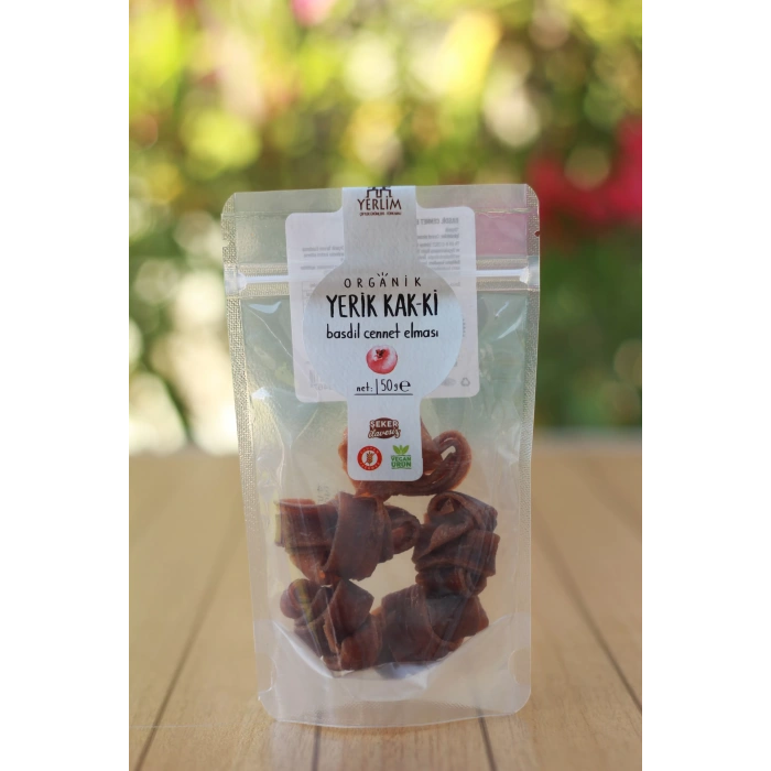 Yerlim Organik Yerik Kak-Ki - Basdil Cennet Elması (50gr): Cennet elmasının (kak-ki) kendi doğal ve yoğun tatlılığını öne çıkaran bu çeşidi, meyvenin saf lezzetini arayanlar için mükemmeldir. Besleyici ve doyurucu bir atıştırmalıktır.